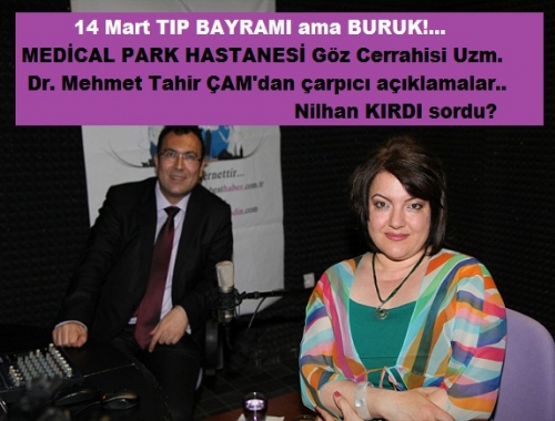 Bugün Medical Park Hastanesi göz cerrahisi doktoru Mehmet Tahir ŞAM ile beraberiz. Sayın ŞAM, 14 Mart Tıp Bayramı nedeniyle bir sağlık neferi olarak öncelikle sizi ve çalıştığınız kurum olan MEDİCAL PARK Hastanesindeki mesai arkadaşlarınız başta olmak üzere tüm SAĞLIK çalışanlarının bayramını kutluyoruz.