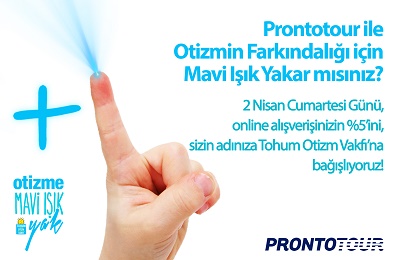 Prontotour 2 Nisan Cumartesi günü, web sitesi üzerinden yapacağınız her online tatil turu alışverişinizin %5’ini sizin adınıza, Tohum Otizm Vakfı’na bağışlayacak.