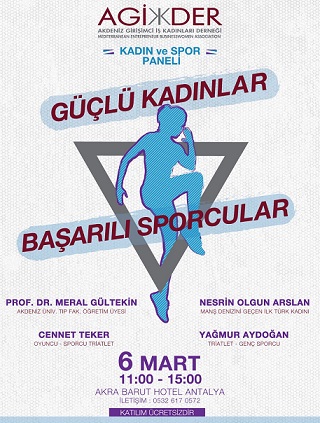 AGİDER, 8 Mart Dünya Kadınlar haftasında ülkemizde kadınlarımızdan başlayarak beden ve ruh sağlığına dikkat çekmek, spor ve sağlıklı yaşam ile insanların yaşam kalitesini artırmanın önemini vurgulamak, kadınların ve onların vasıtasıyla tüm aile fertlerin yaşam biçimlerinde sporun ve sağlıklı yaşamın yer almasını sağlamak amacıyla 6 Mart Salı günü 11.00- 15.00 saatleri arasında Akra Otel’de “Kadın ve Spor Paneli” düzenleyecektir.