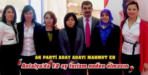 AK Parti Antalya Milletvekili aday adayı Mahmut Er, hükümetin hızlı tren ve havaalanı yatırımlarını örnek göstererek 12 ay turizmden payını alan bir Antalya için bu çalışmaların yanı sıra STK, yerel yöneticiler ve milletvekillerinin işbirliğine gerek duyulduğunu belirtti.