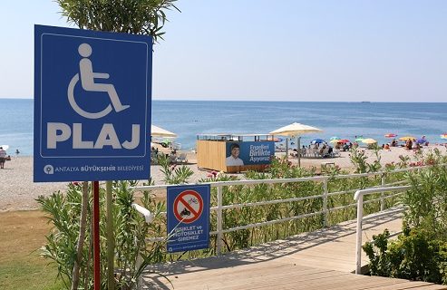 Antalya’da yaşayan veya tatil için gelen engelli vatandaşların rahatlıkla denizden istifade etmesine olanak sağlayan Büyükşehir Belediyesi’nin “Engelsiz Plajı” takdir topluyor. Antalya’da yaşayan veya tatil için kente gelen engelli bireyleri denizle buluşturan proje yüzleri güldürüyor.