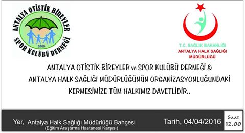 Nisan ayı OTİZM FARKINDALIĞI ETKİNLİKLERİ çerçevesinde Antalya İl Halk Sağlığı Müdürlüğü, Antalya Otistik Bireyler Spor Kulübü Derneği yararına ve dernekle ortaklaşa bir otizm farkındalığı kermesi düzenledi. 4 Nisan Pazartesi günü Saat 12.00 de yapılacak olan kermes, Antalya eğitim araştırma hastanesi karşısında il halk sağlığı müdürlüğü bahçesinde yapılacak.