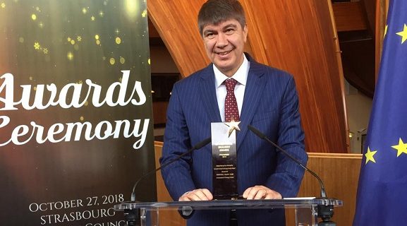 3. Uluslararası Kent Araştırmaları Kongresi kapsamında Strazburg’ta Avrupa Konseyi Binası’nda düzenlenen toplantıya ve ödül törenine katılan Antalya Büyükşehir Belediye Başkanı Menderes Türel, ödülü Avrupa Konseyi Yerel ve Bölgesel Yönetimler Kongresi Genel Sekreteri Andreas Kiefer’ın elinden aldı.