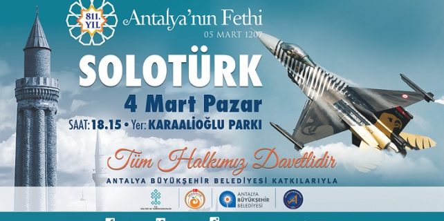 Geçtiğimiz yıl ilki gerçekleştirilen ¬Antalya’nın fethi kutlamaları bu yıl 1-5 Mart tarihleri arasında dolu dolu bir programla gerçekleştirilecek. Antalya Valiliği, Büyükşehir Belediyesi ve Akdeniz Üniversitesi işbirliği ile düzenlenen kutlama için tüm hazırlıklar tamamlandı. Fetih kutlamaları tüm Antalya’yı saracak. Yürüyüşler, koşular, konferansların yanı sıra, Türk Hava Kuvvetleri’nin akrobasi timi Solo Türk de gösterisiyle gökyüzünü şenlendirecek.