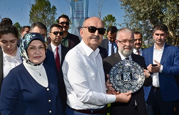 Ağaç dikiminin ardında, EXPO 2016 Antalya Ajansı Genel Sekreter Vekili Faik Akturan, Sağlık Bakanı Mehmet Müezzinoğlu’na ziyaretin anısına EXPO 2016 yazılı gümüş işlemeli tabak takdim etti.