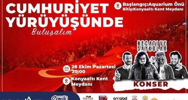 AQUARİOM ÖNÜNDEN BAŞLIYOR Cumhuriyetin 96. Kuruluş yıl dönümü, Konyaaltı’nda coşkuyla kutlanacak. Konyaaltı Belediyesi tarafından bu yıl ilk kez düzenlenecek olan ‘Cumhuriyet Yürüyüşü’ için tüm hazırlıklar tamamlandı. Konyaaltı Aquarium önünden saat 18.30’da başlayacak olan Cumhuriyet Yürüyüşü, Konyaaltı Kent Meydanında saat 20.00’de sahne alacak olan Necati ve Saykolar Konseriyle son bulacak.
