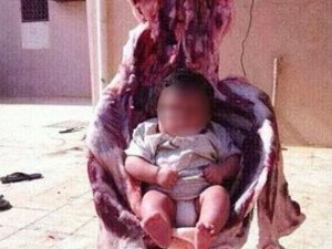 Bir bebeğin kanlar içindeki kurban salıncak yapılarak oturtulmasına ilişkin fotoğraf tepki çekti. Fotoğrafın nerede çekildiği henüz bilinmiyor.