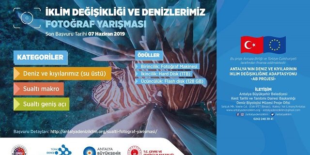 Antalya Büyükşehir Belediyesi, “Antalya’nın Deniz ve Kıyılarının İklim Değişikliğine Adaptasyonu” başlıklı Avrupa Birliği Projesi kapsamında 13-14 Haziran 2019 tarihleri arasında “İklim Değişikliği ve Denizlerimiz Festivali” düzenliyor. Festival kapsamında “İklim Değişikliği ve Denizlerimiz” konulu ödüllü resim, şiir, kompozisyon, su üstü ve altı fotoğraf yarışması düzenlenecek.