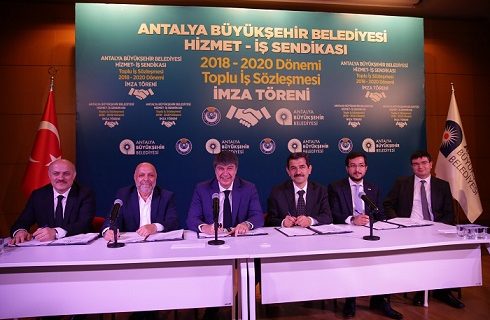 Antalya Büyükşehir Belediyesi ile Hizmet-İş Sendikası arasında 464 kadrolu işçiyi kapsayan Toplu İş Sözleşmesi, törenle imzalandı. İşçi yevmilerine ilk yıl için günlük 16 lira, ikinci yıl için enflasyon oranında zam yapıldı. Başkan Menderes Türel, “30 Büyükşehir Belediyesi arasında işçisine en yüksek ücreti ödeyen Antalya Büyükşehir Belediyesidir. Helali hoş olsun” dedi.
