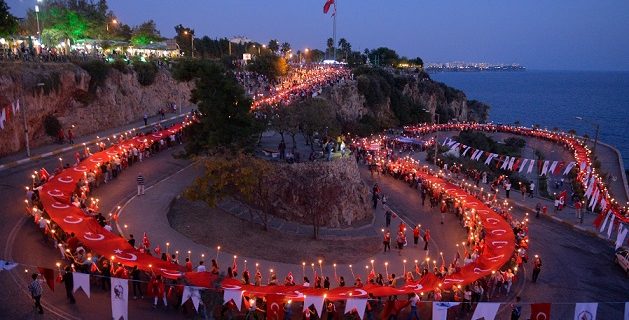 Yaklaşık 150 sivil toplum örgütünü kapsayan Cumhuriyet için Antalya Elele Platformu’yla düzenlenecek kutlamalar 28 Ekim Cumartesi saat 18.00’de Konyaaltı varyantında fener alayı ile başlayacak. Yaklaşık 3 kilometre sürecek fener alayında 600 metrelik Türk Bayrağı taşınacak. Antalyalılar, fener alayına Türk ve Atatürk bayrakları ile katılabilecek. Fener alayı, Cumhuriyet Meydanı’nda tamamlanacak.
