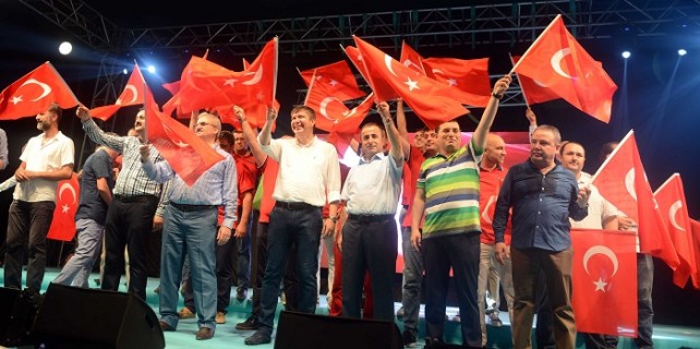 Antalya, darbe girişimine karşı, bir kez daha Cumhuriyet Meydanı’nda buluştu. 15 Temmuz’dan bu yana tutulan nöbet, 30’un üzerinde sanatçının katılımı ile şölen havasına büründü. Demokrasi şölenine on binlerce vatandaş, sivil toplum örgütleri, kentin yöneticileri ve siyasi parti temsilcileri tam kadro katıldı. Antalya Valisi Münir Karaloğlu, Antalya Büyükşehir Belediye Başkanı Menderes Türel, Muratpaşa Belediye Başkanı Ümit Uysal, Konyaaltı Belediye Başkanı Muhittin Böcek, Döşemealtı Belediye Başkanı Turgay Genç, Kepez Belediye Başkanı Hakan Tütüncü, İl Emniyet Müdürü Cemil Tonbul, AK Parti İl Başkanı Rıza Sümer, CHP İl Başkanı Semih Esen, MHP İl Başkanı Mustafa Aksoy, ATSO Başkanı Davut Çetin, ATSO yönetim kurulu üyeleri, Antalyaspor yönetimi de halkla bir araya geldi. ÜNLÜLERLE HALK BİRARAYA GELDİ Geceye Gezegen Mehmet, Vatan Şaşmaz, Ece Erken, Hopdedik Ayhan, Afrikalı Ali, Adem Metan, Ersin Düzen, Mustafa Ceceli, Bengü, Murat Dalkılıç, Alişan, Nihat Doğan, Kutsi, Berkay, Berdan Mardini, Sefa Doğanay, Doğuş, Ahmet Selçuk İlkan, İntizar, Serkan Kaya, Berksan, Davut Güloğlu, Mustafa Yıldızdoğan, Yeşim Salkım, Emir Berke Zincidi, Survivor yarışmacıları Nagehan, Efecan, Faik Öztürk, Saruhan Hünel gibi ünlü isimler katıldı. Ünlü sanatçılarla halkın buluştuğu demokrasi şöleninde, ilk olarak Bengü ‘Bir Başkadır Benim Memleketim’ şarkısını seslendirdi. Ardından ise Mustafa Yıldızdoğan ‘Türkiyem’ şarkısını söylerken, Mustafa Ceceli ile birlikte onbinler İstiklal Marşı’nı söyledi.
