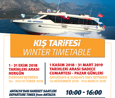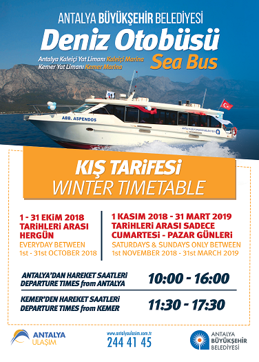Antalya’yı deniz ulaşımıyla tanıştıran Deniz Otobüsleri, yaz sezonunun bitmesiyle tarife değişikliğine gitti. 1 Ekim 2018 Pazartesi gününden itibaren yaz tarifesinden kış tarifesine geçiş yapacak deniz otobüsleri 1-31 Ekim 2018 tarihlerinde haftanın 7 günü Antalya Kaleiçi Yat Limanı’ndan 10.00 ve 16.00 saatlerinde, Kemer Marina’dan da 11.30 ve 17.30 saatlerinde hareket edecek.
