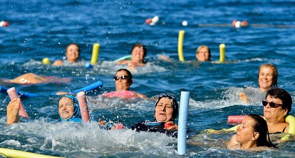 Antalya’da kadınlar hafta sonuna Muratpaşa Belediyesi’nin su cimnastiği ve fizik tedavi öğretmeni Rachid Arnouss’la düzenlediği su cimnatsiğiyle başladı. İnciraltı Halk Plajı’nda kadınlar Türkiye’de ilk defa denizde jimnastik yaptı.