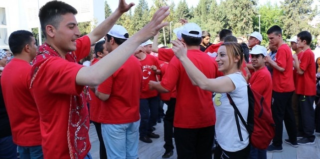 Antalya Büyükşehir Belediyesi yeni hizmet binası önünde engelli gençler için asker uğurlama töreni düzenlendi. Özel bireylerin sevincine Büyükşehir Belediye Başkanı Menderes Türel’in eşi Ebru Türel de ortak oldu. Ebru Türel, Büyükşehir Belediyesi Genel Sekreter Yardımcısı Sanem Öztürk, Daire Başkanları, belediye bürokratları ve asker adaylarının ailelerinin katıldığı asker uğurlama töreni renkli görüntülere sahne oldu. Ellerinde Türk Bayrakları ve boyunlarına takılan al yazmalarla halay çekip, davul zurna eşliğinde zeybek oynayan engelli askerler vatani görevlerini yapacak olmanın mutluluğunu yaşadı.