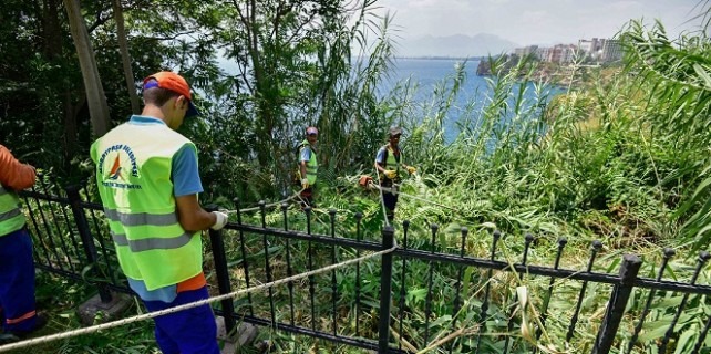 Temizlik İşleri Müdürlüğü bünyesinde sadece falez temizliği için oluşturulan ekip, dağcıların kullandıkları özel ekipmanlarla denizden yüksekliği yer yer 50 metreyi bulan falezlere inerek, elektrikli tırpanlarla ot ve sazlıkları temizliyor. Yaklaşık 7 kilometrelik Lara Caddesi boyunca uzanan Falez parklarında gerçekleştirilen ot ve sazlık temizlik çalışmasının yanı sıra kötü kullanıma bağlı olarak atılan atıklar da toplanıyor.