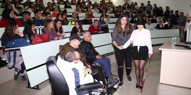 Seminer kapsamında öğrencilerin uygulamaya katılımı sağlanarak engelli bireylerin psikolojileri, yaşam içerisinde karşılaştıkları güçlükler ve doğru yardım teknikleri konularında bilgilendirme yapıldı