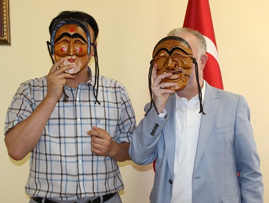 Akturan, heyet başkanı Hun Park’a EXPO 2016 Antalya’nın sembol çiçeği şakayık ile endemik bitkiler kitabı ve çeşitli hediye sundu. Park da kötü ruhları kovduğuna inandıkları karı-koca maskı hediye etti. Park ve Akturan EXPO 2016’nın güzelliklerle geçmesi dileğiyle maskları takarak fotoğraf çektirdi.
