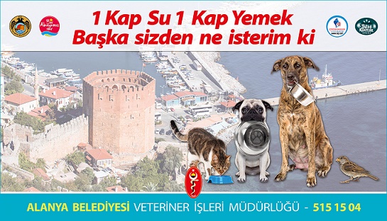 Alanya Belediyesi Veteriner İşleri Müdürlüğü, sokak hayvanlarına yönelik ‘1 kap su 1 kap yemek başka sizden ne isterim ki” kampanyası başlattı. Şehrin muhtelif yerlerine asılan afiş ve bilbordlarla halkı duyarlı olmaya çağırdıklarını belirten Veteriner İşleri Müdürü Ali Yavuz, “İçinde bulunduğumuz yazın en sıcak günlerinde, canlıların su ihtiyaçlarında da bir artış olmaktadır. Özellikle sokaklarda sahipsiz olarak barınmaya çalışan ve yaşam savaşı veren, can dostlarımız olan kedi ve köpekler başta olmak üzere, kuşlar ile birlikte bütün canlıların ihtiyaçlarının giderilebilmesi anlamında, su ve yiyecek ile doldurulmuş kapların bu canlıların ulaşa bileceği ve barınabileceği yerlere konulması önem arz etmektedir.” dedi.