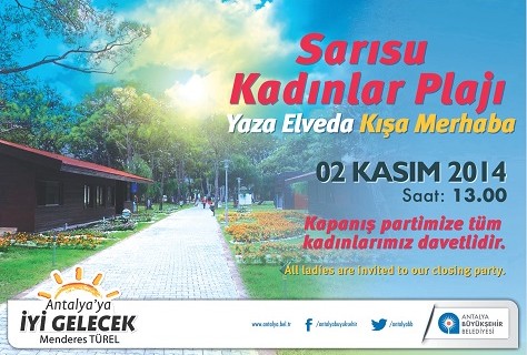 Kaliteli hizmetiyle tüm Türkiye’nin dikkatini çeken Kadınlar Plajı, 2 Kasım Pazar günü saat 13.00’de düzenlenecek “Yaza Elveda Kışa Merhaba” partisi ile yaz sezonuna veda ediyor. Büyükşehir Belediye Başkanı Menderes Türel, Antalyalı kadınları Sarısu’daki partiye davet etti.