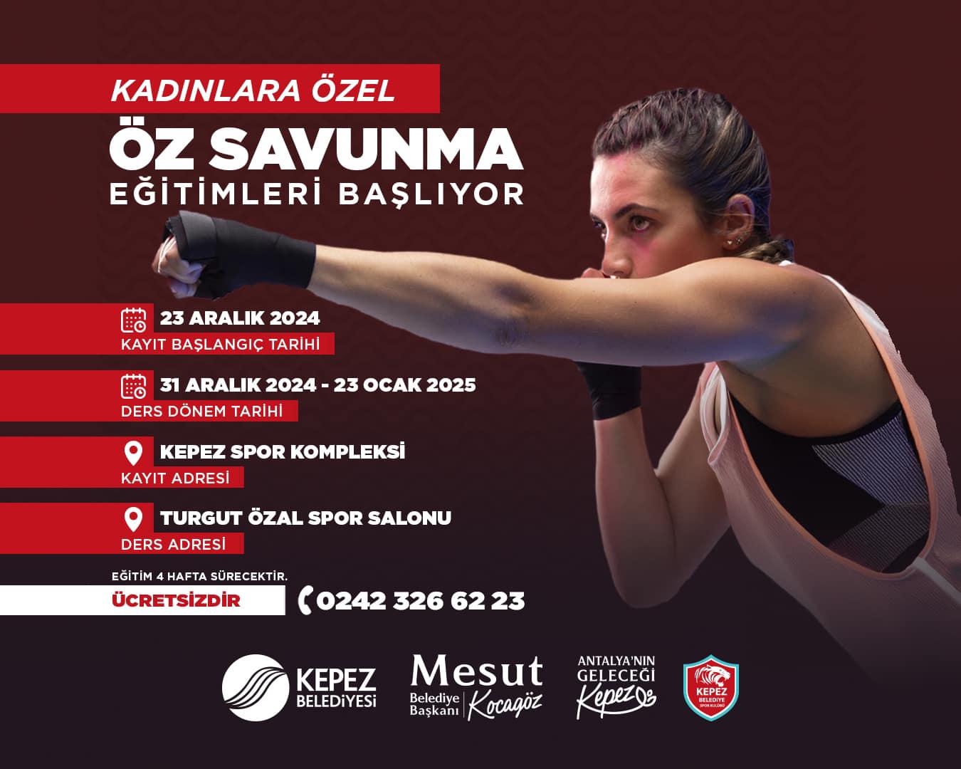 Son yıllarda artan kadın cinayetlerine ve şiddet olaylarına dikkat çeken Kepez Belediyesi, kadınların kendilerini savunma becerilerini geliştirmesi için uzman eğitmenler eşliğinde ‘Öz Savunma Eğitimi’ verecek. Turgut Özal Spor Salonu’nda haftanın dört günü düzenlenecek kurslar, tamamen ücretsiz olacak. Kepez Belediyesi, Öz Savunma Eğitimleri ile kadınların kişisel güvenliğini artırmayı, fiziksel ve mental dayanıklılık kazanmalarını, öz güvenlerini yükseltmelerini ve stresle başa çıkma yeteneklerini geliştirmeyi hedefliyor. Kepez Belediyesi, kendini güvende hissetmek, fiziksel ve mental olarak güçlenmek isteyen tüm kadınları Öz Savunma Eğitimlerine bekliyor.