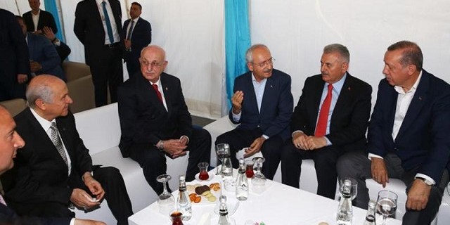 Türk milletinin bin yıl önce Malazgirt’te hangi inanç ve kararlılıkla Anadolu’nun kapılarını açmışsa, 15 Temmuz’da da aynı hissiyatla darbecilerin karşısına dikildiğini vurgulayan Cumhurbaşkanı Erdoğan, şunları söyledi: “Süleyman Şah 1075 yılında, bu coğrafyadaki ilk devletimizi hangi vizyonla kurmuşsa, 15 Temmuz’da da ülkemize aynı vizyonla, aynı ufukla sahip çıktık. Osman Gazi, 1299’da tarihin en kudretli devletini hangi temeller üzerine bina ettiyse, biz de o gece Türkiye’yi aynı ilkeler etrafında müdafaa ettik. Ecdadımız 100 yıl önce hangi idrakle Çanakkale’de kanının son damlasına kadar mücadele ettiyse, 15 Temmuz’da da aynı iradeyle darbecileri geri püskürttük. Gazi Mustafa Kemal’in İstiklal Harbini başlatmasını ve zafere ulaştırmasını sağlayan inancın bir benzeri, 15 Temmuz’da Türkiye’nin tüm şehirlerinde adeta kol geziyordu. 15 Temmuz, dostlarımıza bu ülkenin, sadece siyasi, ekonomik, diplomatik saldırılara değil; aynı zamanda askerî sabotajlara karşı da güçlü olduğunu, yıkılmayacağını, rayından çıkmayacağını göstermiştir. Aynı gece Türkiye’nin yerle yeksan olması için ellerini ovuşturarak bekleyen düşmanlarımız ise ertesi güne, bundan sonra işlerinin çok daha zor olduğunu görmenin kahrıyla uyandılar. Şimdi bugün burada, Yenikapı Meydanı’nda Cumhurbaşkanıyla, Başbakanıyla, CHP ve MHP Genel Başkanlarıyla, 81 vilayetimizdeki her görüşten, her meşrepten insanımızla verdiğimiz şu görüntü var ya, işte bu görüntü, inanın bana, ülkemizin düşmanlarını, en az 16 Temmuz sabahı kadar üzmüştür, kahretmiştir. İşte onun için her zaman ne diyoruz? Bir olacağız, iri olacağız, diri olacağız, kardeş olacağız, hep birlikte Türkiye olacağız.”
