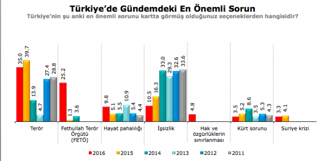 Kadir Has Üniversitesi Türkiye Araştırmaları Merkezi tarafından her yıl Aralık ayında gerçekleştirilen, “Türkiye Sosyal-Siyasal Eğilimler Araştırması” 2016 yılı sonuçları açıklandı. Türkiye’de mevcut ve olası sorunlar ile gündeme ilişkin toplumun bakışını tespit eden araştırma, kamuoyunun nabzını ortaya koyuyor. Araştırmaya göre Türkiye’de 2016 yılında halk en büyük sorun olarak ‘Terör’ dedi. PKK ve İŞİD’in yanı sıra Paralel Devlet Yapılanması (PDY) şeklinde adlandırılan FETÖ de ciddi bir tehdit olarak görülüyor. Halk FETÖ ile mücadele yöntemlerini yeterli bulsa da, mücadeleye devam edilmesi gerektiğine de inanıyor.