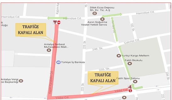 ASAT Genel Müdürlüğü’nden yapılan açıklamada, bölgede yürütülen yağmursuyu drenaj çalışmaları kapsamında 15.12.2016 tarih 895 sayılı UKOME Genel Kurul kararına istinaden, Defterdarlık Kavşağı’nın Hamidiye Caddesi ile Kazım Karabekir Caddesi arasının ve Yıldız Caddesi’nin kuzey aksının 17.12.2016 – 28.02.2017 tarihleri arasında trafiğe kapatılacağı belirtildi. Sürücülerin bu süreçte alternatif güzergah olarak Piri Reis ve Hamidiye Caddeleri güzergahını kullanacakları kaydedildi. Sürücüler, trafik işaretlerine uymaları konusunda uyarıldı.