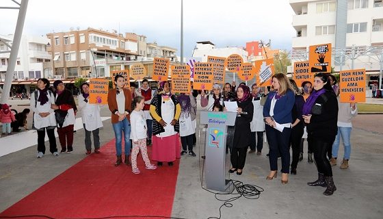 Manavgat Belediye Başkanı Şükrü Sözen’in, kadınların kent ve aile ekonomisine katkıda bulunması amacıyla oluşturduğu Toros Kadınları Emek Pazarı’ndaki emekçi kadınlar, “25 Kasım Kadına Yönelik Şiddetle Mücadele Günü’nde kentte farkındalık yaratmak amacıyla “Kadına Şiddete Dur” etkinliği düzenledi. Pazartesi Pazarı’nda düzenlenen etkinliğe, Manavgat Belediyesi Başkan Yardımcısı Sebahat Çevik, Antalya Barosu Manavgat Temsilciliği Kadın Hakları Komisyonu üyeleri, belediye birim müdürleri Toros Kadınları ve çok sayıda vatandaş katıldı. Büyük bir özenle hazırlanan dövizlerle, kadına şiddete “hayır” diyen emekçi kadınlar, şiirler okudu ve yüzlerine yaptıkları şiddeti temsil eden boyalar ile etkinliklerini gerçekleştirdi. Farkındalık yaratan etkinliğin ardından, Toros Kadınları Emek Pazarı’nda el sanatlarında üzerinde üretim yapan emekçi kadınlardan Birsen Şahin ile emekli öğretmen Memnune Böke, kadınlar için yazdığı şiiri okurken, emekçi kadın Kezban Yerlisu ise kadınların sosyal hayat içerisinde fiziki ve psikolojik olarak yaşadığı zorlukları anlatan bir konuşma yaptı. Toros Kadınları’na destek amacıyla Antalya Barosu Manavgat Kadın Hakları ve Toplumsal Cinsiyet Eşitliği Komisyonu Başkanı Umut Çiftçi ise farkındalık yaratan eylemin önemine vurgu yaparkak, emek pazarı oluşumunun öncülüğünü yapan Manavgat Belediye Başkanı Şükrü Sözen’e teşekkür etti. Eylem sonunda basın açıklamasını yapan Manavgat Belediye Başkan Yardımcısı Sebahat Çevik ise, kadınların yaş, sosyo-ekonomik durum ayırt etmeksizin her türlü şiddete uğradığını söyledi. Çevik, “ Toplum içerisinde kadınlara yönelik işlenen suçlara sessiz kalmak demek bir sonraki hedefin biz olduğunu kabullenmek demektir. Bütün kadınlarımızın var gücüyle bu mücadele içerisinde yer alması gerektiğine inanıyoruz” dedi.