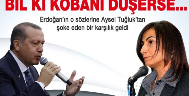 Erdoğan’ın bu açıklamasına Suriye sınırında askere taş atmasıyla gündeme gelen Bağımsız Van Milletvekili Aysel Tuğluk, twittter hesabından tepki gösterdi. Tuğluk açıklamasında Erdoğan’a cevap olarak “Çok beklersin… Bil ki Kobani düşerse Ankara’da düşer. Kürtler de kendi kaderini tayin eder” dedi.