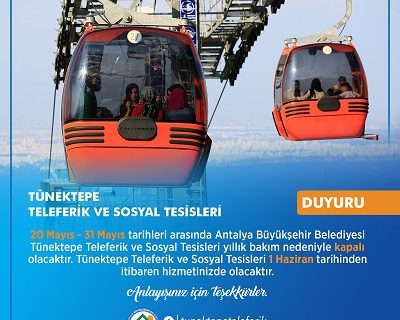 Antalya Büyükşehir Belediyesi Tünektepe Teleferik ve Sosyal Tesisleri yaz sezonu öncesi yıllık periyodik bakıma giriyor. Tesisler, 20 Mayıs – 31 Mayıs tarihleri arasında hizmet veremeyecek.