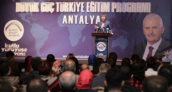 Antalya siyaset akademisinin final dersinde konuşan Büyükşehir Belediye Başkanı Menderes Türel, “Başkanlık sistemi ile bu ülkenin ayağındaki prangalar çözülecek, demokrasi daha da güçlenecektir” dedi. 15 Temmuz’un sadece bir siyasi partiyi değil, tüm milleti hedef aldığını kaydeden Başkan Türel “15 Temmuz’da görev almaya çalışan hain çete bu milletin tapusunu başkalarına vermeye çalıştı. İnsanların hayatına kast edilip 247 şehidimiz varken, Cumhurbaşkanımız öldürülmeye çalışılıyorken, buna tezgah diyenler var. Bunu diyenlere yazıklar olsun” diye konuştu.