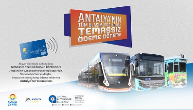 Antalya’da yaşamanın ayrıcalığını ve farkındalığını hissetmeleri için 2016 yılında başlatılan temassız kredi kartı ile ödeme yöntemi tüm toplu ulaşım araçlarında kullanılıyor. Tüm ulaşım araçlarında uygulanan temassız ödeme sistemi büyük memnuniyet yaratıyor. Temassız özellikli banka kartları ile imzasız ve şifresiz kolay ödeme imkanının tadını çıkaran vatandaşların tek yapması gereken kartını kart okuyucuya yaklaştırması. Böylece kredi kartı ibaresi görülüyor ve tam ücret çekimi yapılıyor.