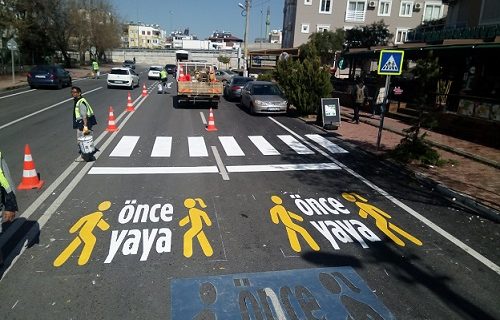 yaya geçitlerine sürücülerin görebileceği şekilde “Önce Yaya” görselleri ile birlikte çizgi